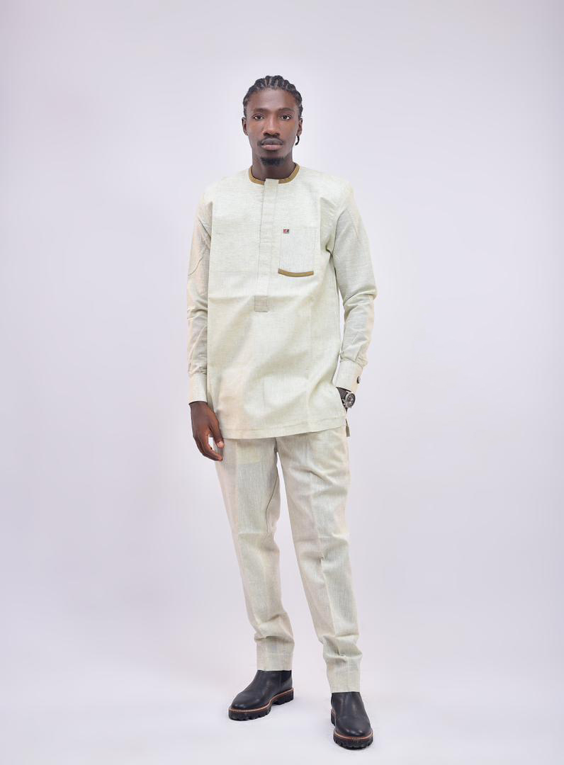 Cet ensemble masculin se distingue par sa simplicité sophistiquée. Réalisé dans un tissu beige clair à texture légèrement satinée, le haut présente une coupe droite avec un col mao épuré et une boutonnière partielle. Une poche poitrine ornée d’une fine bordure contrastée ajoute un détail subtil mais élégant. Les manches longues et les poignets simples renforcent l’élégance minimaliste de la tenue. Le pantalon assorti, à coupe droite, complète l’ensemble pour un look raffiné et intemporel, idéal pour des cérémonies ou des occasions spéciales.