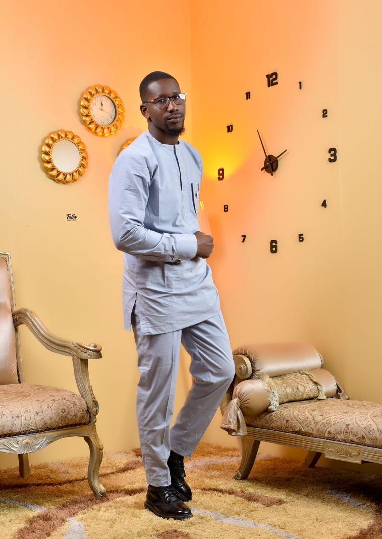 Cet ensemble masculin reflète une élégance classique et intemporelle. Confectionné dans un tissu uni bleu clair, il se compose d’un haut à coupe droite avec un col mao discret, une boutonnière partielle et une poche poitrine minimaliste. Les manches longues, agrémentées de poignets ajustés, ajoutent une touche raffinée. Le pantalon assorti, à la coupe droite et confortable, complète cet ensemble idéal pour des occasions formelles ou des sorties décontractées.